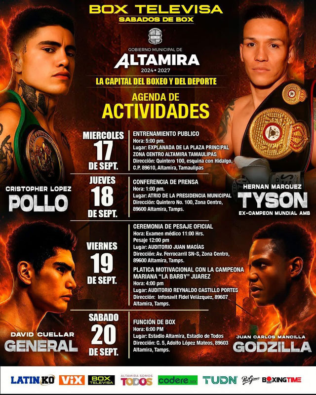 El programa de actividades inicia el miércoles 17 de septiembre con un entrenamiento público a las 5:00 p.m. en la explanada de la Plaza Principal de Altamira, donde los asistentes podrán presenciar de cerca la preparación de los pugilistas.