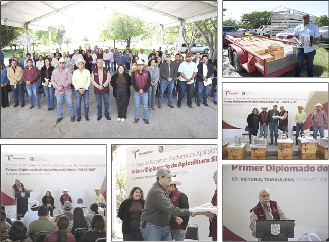 Ciudad Victoria, Tamaulipas. – Como parte del programa Fomento a la Apicultura, la Secretaría de Desarrollo Rural, Pesca y Acuacultura del Gobierno del Estado de Tamaulipas, en coordinación con la Facultad de Medicina Veterinaria y Zootecnia (FMVZ) de la Universidad Autónoma de Tamaulipas (UAT), llevó a cabo la entrega de colmenas a los alumnos destacados del 1er Diplomado de Apicultura, realizado de marzo a junio de 2024.
