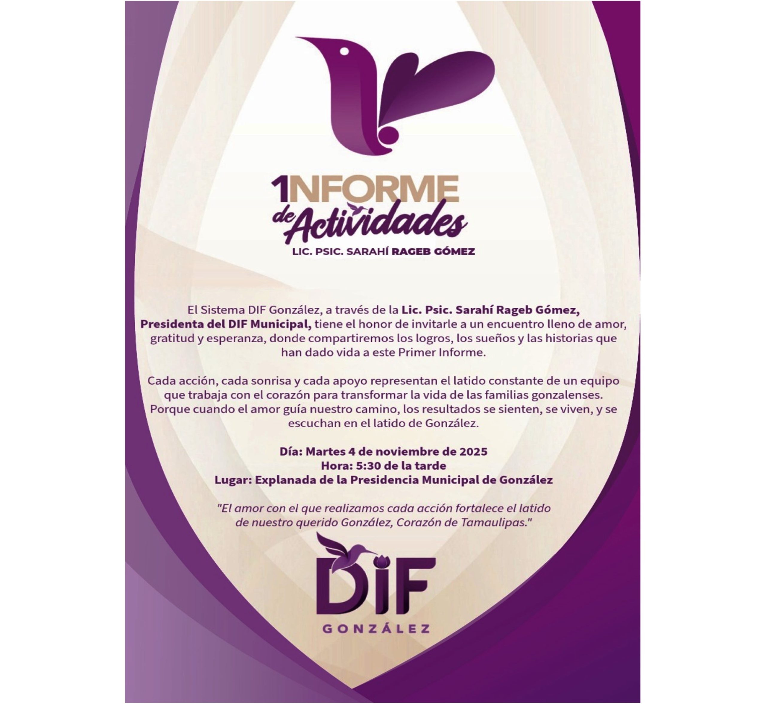 Se extiende una cordial invitación a todas las familias de González para que asistan a este importante acto de rendición de cuentas y conozcan de primera mano las acciones que consolidan al DIF Municipal como una institución de puertas abiertas y de resultados.