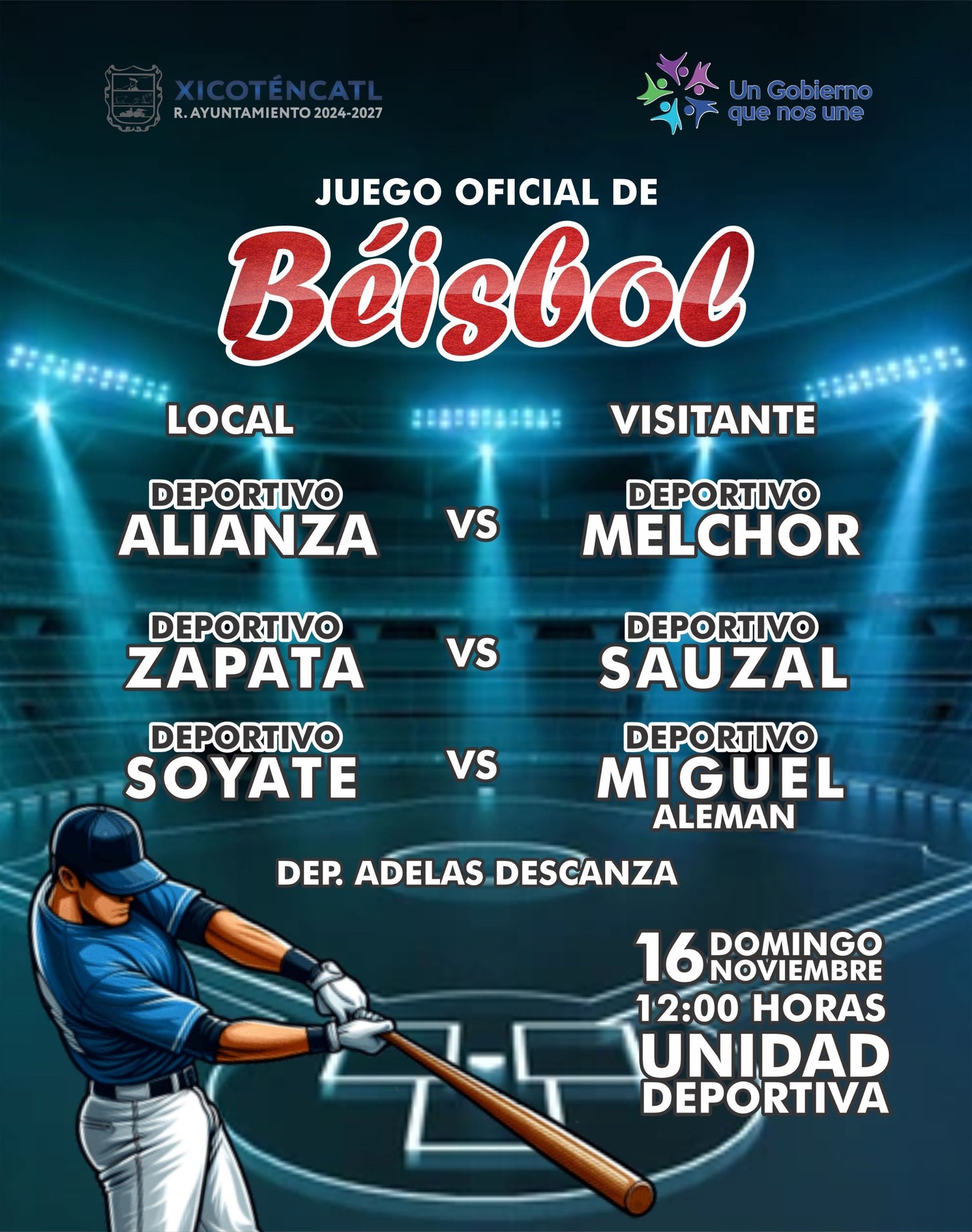 Xicoténcatl, Tam. — El Gobierno Municipal, a cargo de la presidenta Mariela López Sosa, informó la realización de los juegos oficiales de béisbol este domingo 16 de noviembre en la Unidad Deportiva, a partir de las 12:00 horas.
