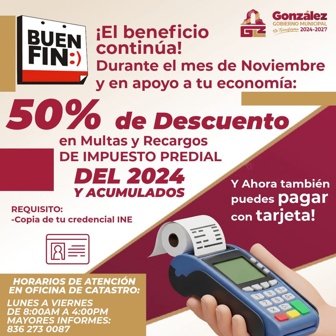 El Gobierno Municipal de González ha lanzado una iniciativa para apoyar la economía de las familias del municipio, ofreciendo un descuento significativo en multas y recargos del Impuesto Predial. Esta medida, vigente durante todo el mes de noviembre, busca facilitar la regularización de los contribuyentes y fomentar su participación en el desarrollo local.