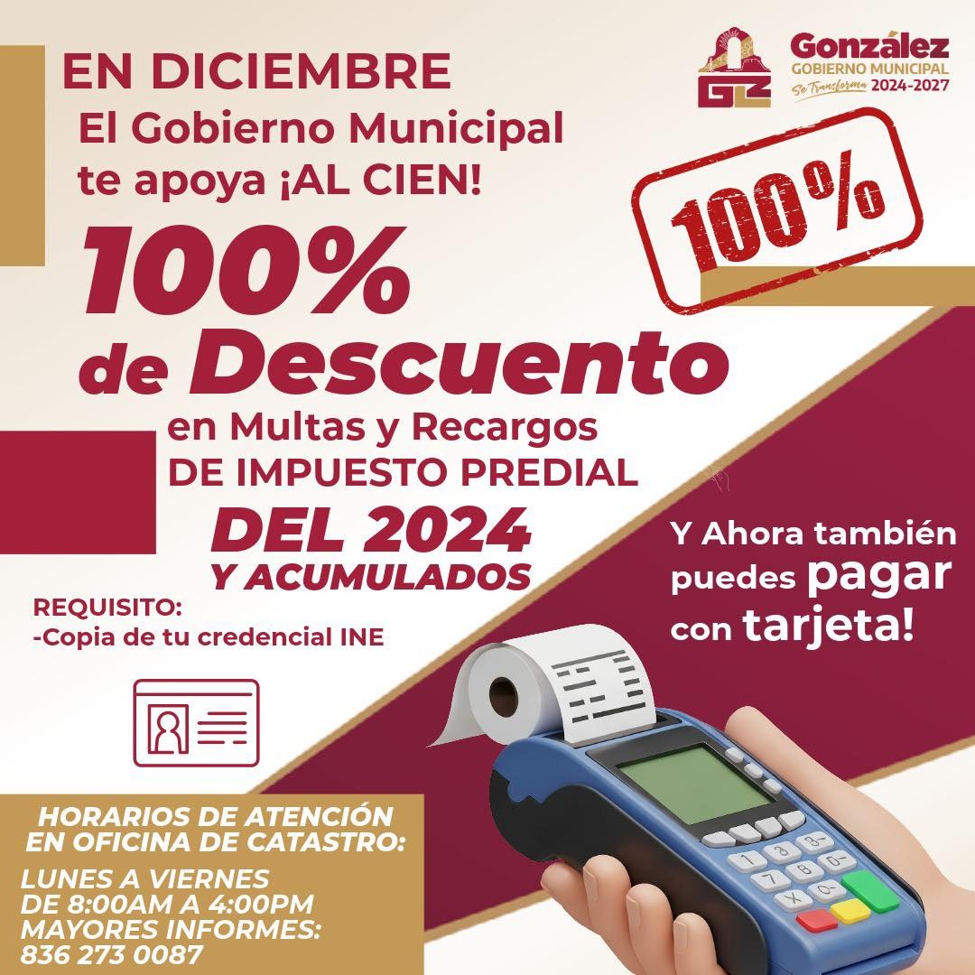 El Gobierno Municipal de González, Tamaulipas, en su compromiso por apoyar la economía de sus habitantes, ha lanzado una importante campaña de descuentos para el mes de diciembre, ofreciendo el 100% de descuento en multas y recargos del Impuesto Predial del 2024 y acumulados. Esta iniciativa busca brindar a los contribuyentes la oportunidad de regularizar su situación patrimonial sin los costos adicionales que conllevan los recargos y las multas.