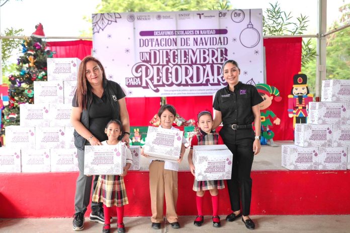 González, Tamaulipas. – Durante el mes de diciembre, el Sistema DIF Tamaulipas, que preside la doctora María de Villarreal, realizó en todo el estado la entrega de la dotación navideña del Programa Desayunos Escolares “Una Navidad para Recordar”, mediante la cual se benefició a alumnas y alumnos de 2,575 escuelas de los 43 municipios de la entidad.