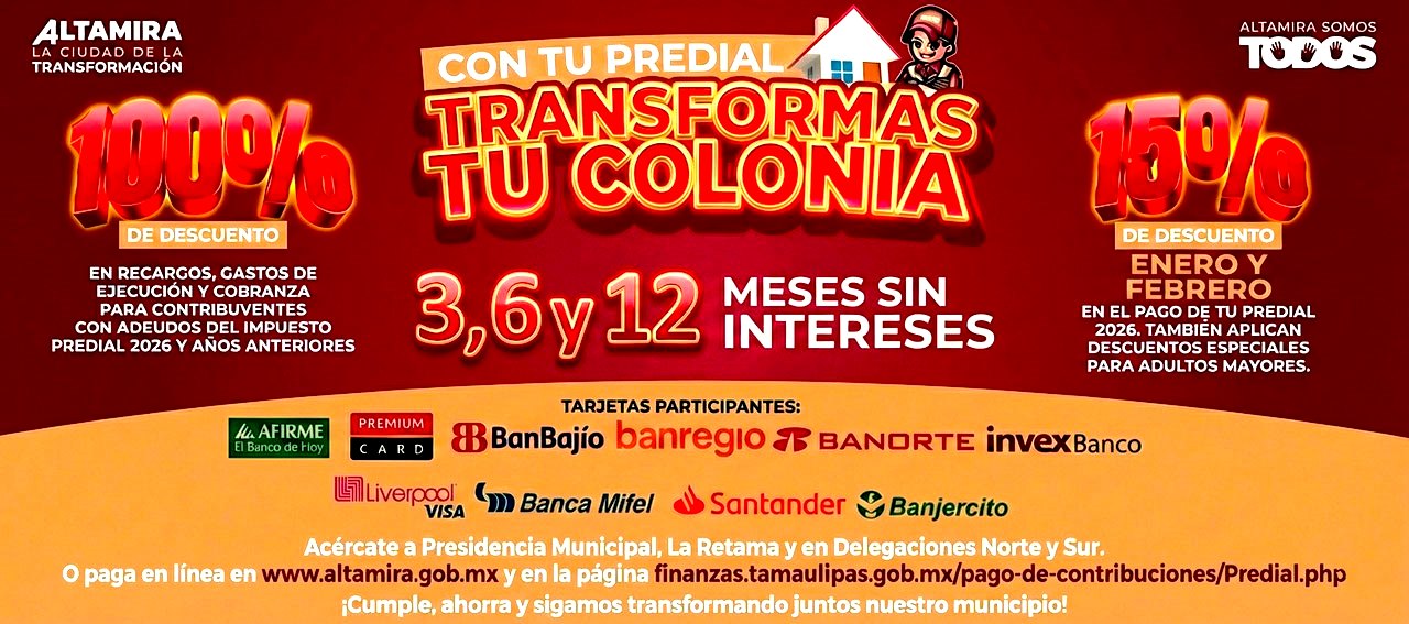 ALTAMIRA, TAM., 22 Enero 2026.- Con el objetivo de fortalecer la economía de las familias altamirenses y fomentar la cultura del cumplimiento fiscal, el Gobierno Municipal de Altamira, que encabeza el Dr. Armando Martínez Manríquez, puso en marcha atractivos programas de apoyo en el pago del impuesto Predial.