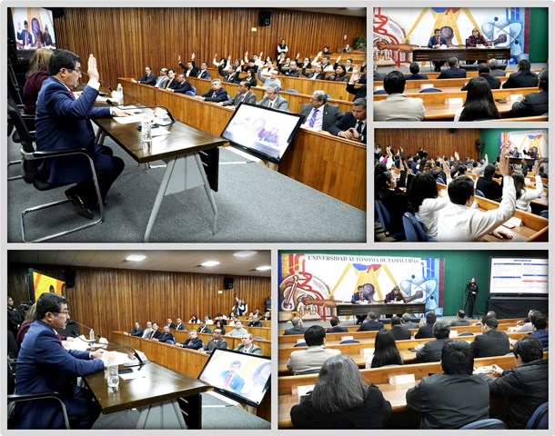 La sesión de trabajo de la Asamblea se llevó a cabo en el Centro de Excelencia del Campus Victoria, en la modalidad a distancia, con la asistencia de las y los directores y representantes de docentes y estudiantes asambleístas de las 26 dependencias académicas de la UAT que participaron desde las sedes norte, centro y sur del estado.