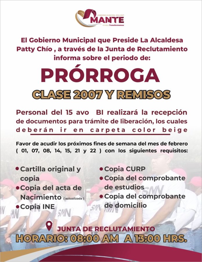 CIUDAD MANTE, TAMAULIPAS. – El Gobierno Municipal de El Mante 2024–2027, encabezado por la alcaldesa Patty Chío, a través de la Junta Municipal de Reclutamiento, hizo un llamado a los jóvenes de la Clase 2007 y remisos para aprovechar el periodo de prórroga establecido para el trámite de liberación de la Cartilla del Servicio Militar Nacional (SMN).
