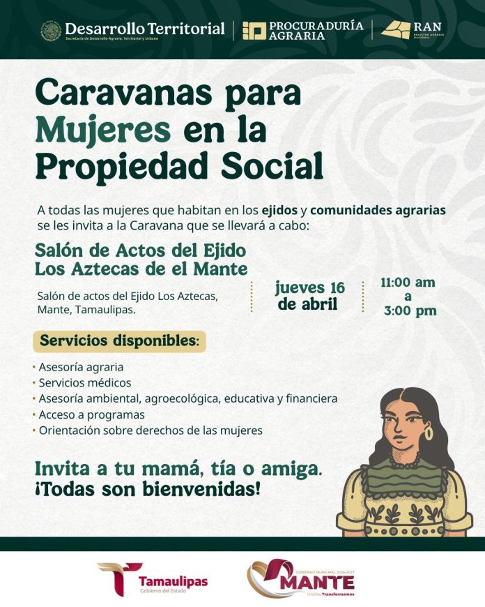 ​El Gobierno Municipal El Mante 2024-2027, presidido por Patty Chío, en coordinación con la Secretaría de Desarrollo Agrario, Territorial y Urbano (SEDATU), la Procuraduría Agraria y el Registro Agrario Nacional (RAN), convoca a todas las mujeres de ejidos y comunidades agrarias a participar en este encuentro integral.