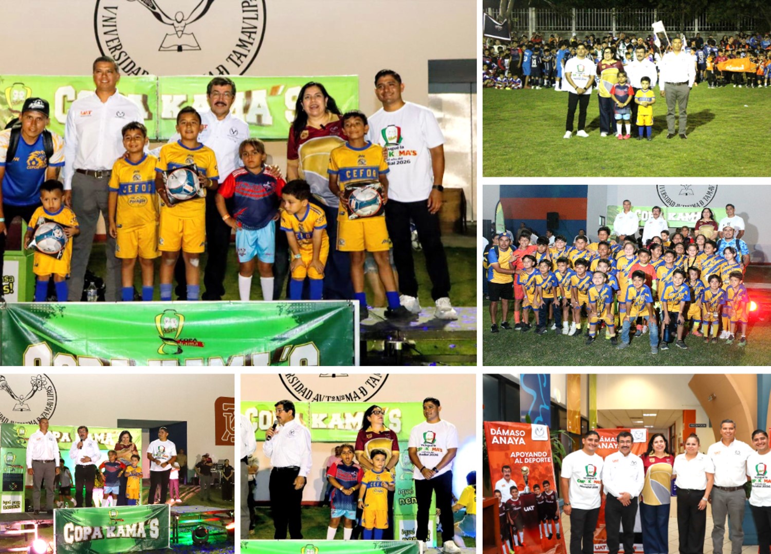 En el marco del fortalecimiento de la vinculación social y el impulso a la formación integral de la niñez y juventud, el rector de la Universidad Autónoma de Tamaulipas (UAT), Dámaso Anaya Alvarado, inauguró la Copa Kama’s de futbol la noche de este viernes 17 de abril en las instalaciones del Gimnasio Multidisciplinario Mante, espacio universitario que fungió como sede del evento.