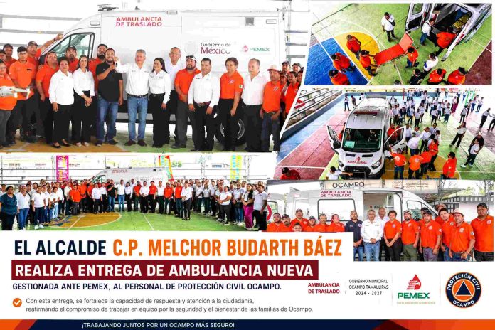 OCAMPO, TAM. – En un paso significativo para el fortalecimiento de la infraestructura de salud y seguridad en el municipio, el alcalde, C.P. Melchor Budarth Báez, encabezó la entrega oficial de una ambulancia completamente nueva destinada al departamento de Protección Civil.
