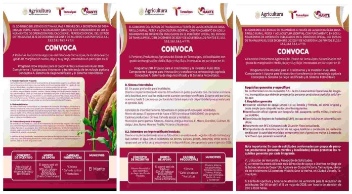 CIUDAD MANTE, TAMAULIPAS. – Con el objetivo de fortalecer la infraestructura hidroagrícola y promover el uso de energías limpias en el sector primario, el Gobierno del Estado de Tamaulipas, en coordinación con el Gobierno Municipal de El Mante (2024-2027), ha lanzado oficialmente la convocatoria para el programa “Impulso para el Crecimiento y la Inversión Rural 2026”.